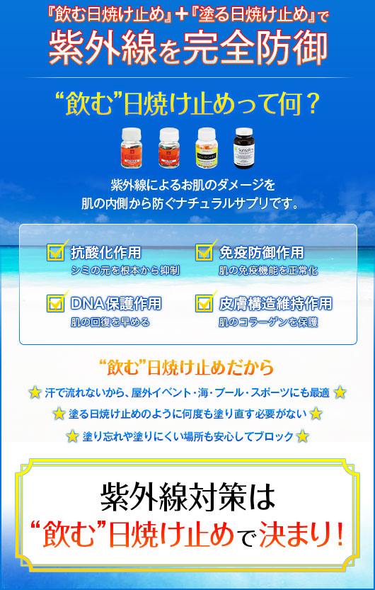 日焼けによるダメージと老化から肌を護るとされるナチュラルアンチエイジングサプリです。