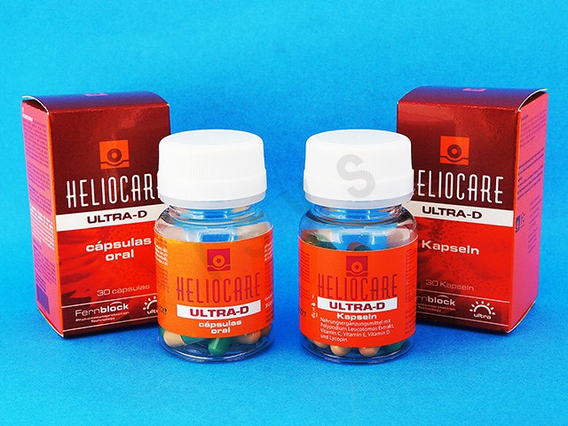 『ヘリオケア・オーラル・ウルトラD』…30カプセル入り。FernBlock(レギュラーの2倍配合)の他に、ルテイン、リコピン、ビタミンD(紫外線を避けると不足しがち)配合。