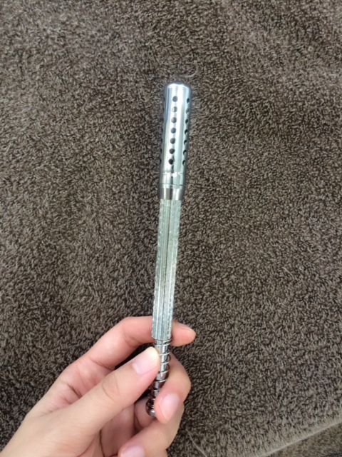 美顔ローラーのような形の本体に、棒状のお灸を入れてから使います(^^♪